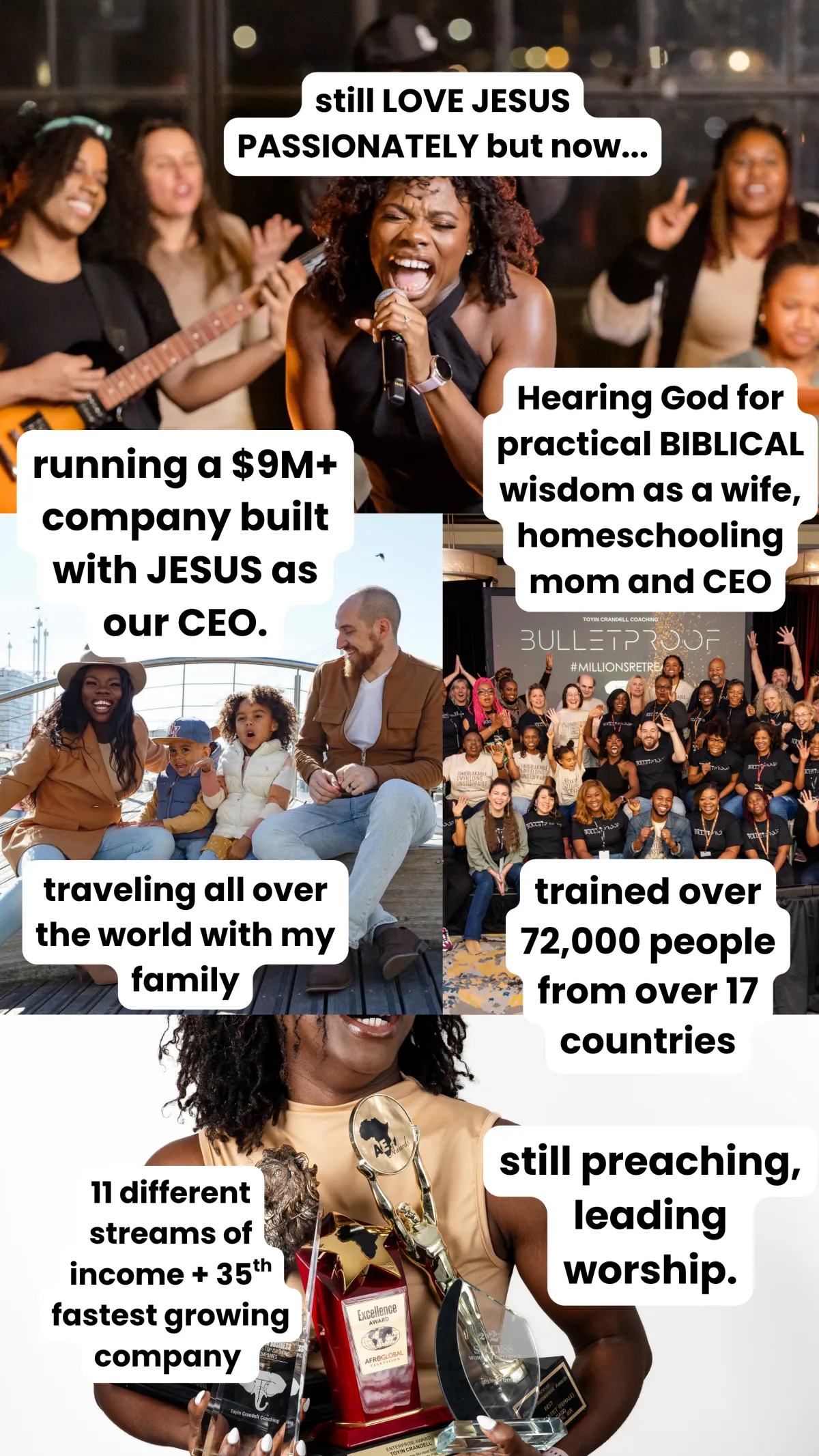 From leading worship across nations and winning awards for Best Female Gospel Artist, serving women in slums in Cambodia, sharing the gospel for years on the streets through freestyle spoken word, playing dominos with the homeless weekly for 3 years, running as a federal electoral candidate, helping other leaders win municipal and federal elections, and coaching believers across the globe to walk in bold, unshakable obedience.