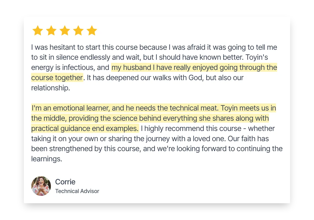 I built this course after decades of living it, with powerful, real-life moments where God’s voice and direction changed everything. And the results to prove it.